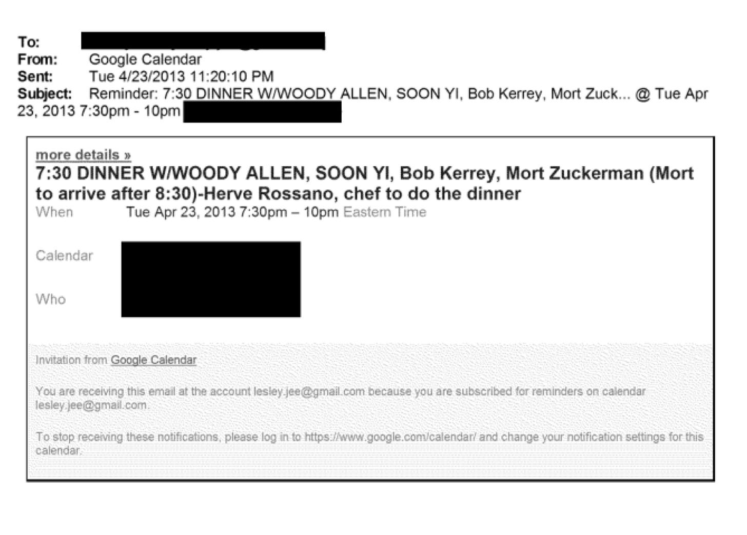 Records show two months later Kerrey had dinner again with Epstein, as well as movie director Woody Allen and Soon-Yi Previn, Allen’s wife. Previn is the adopted daughter of Allen’s former long-time partner, Mia Farrow.