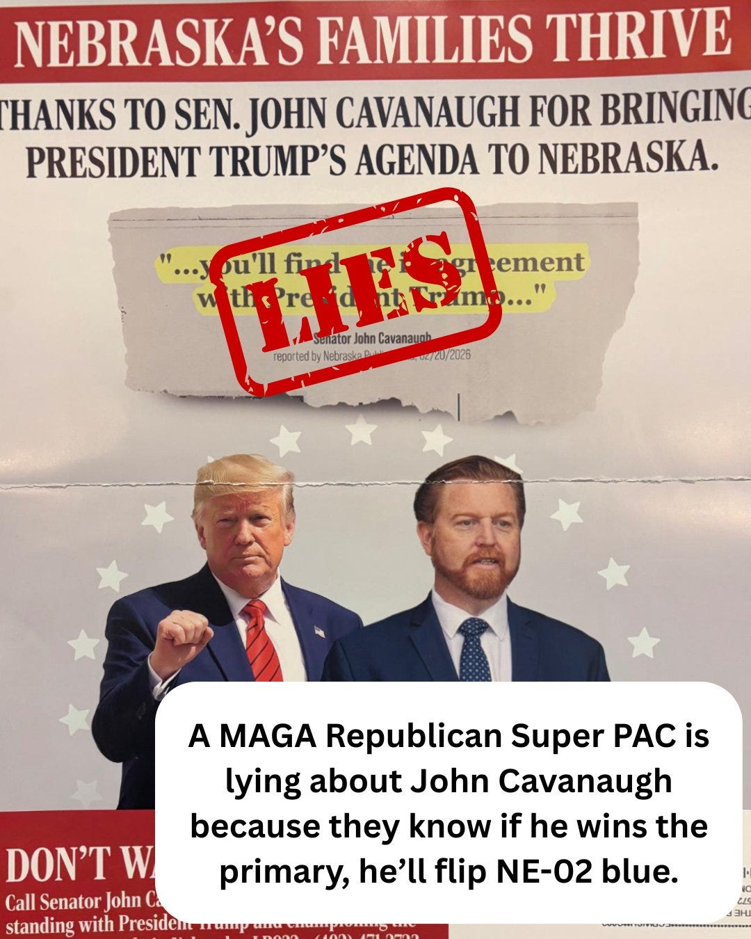 This week, Cavanaugh hit back at a conservative-leaning group, the American Action Network, which recently sent a mailer and posted digital ads tying the candidate to Donald Trump. “Call Senator John Cavanaugh today and thank him for standing with President Trump and championing the MAGA Tax Agenda in Nebraska,” the flier read.