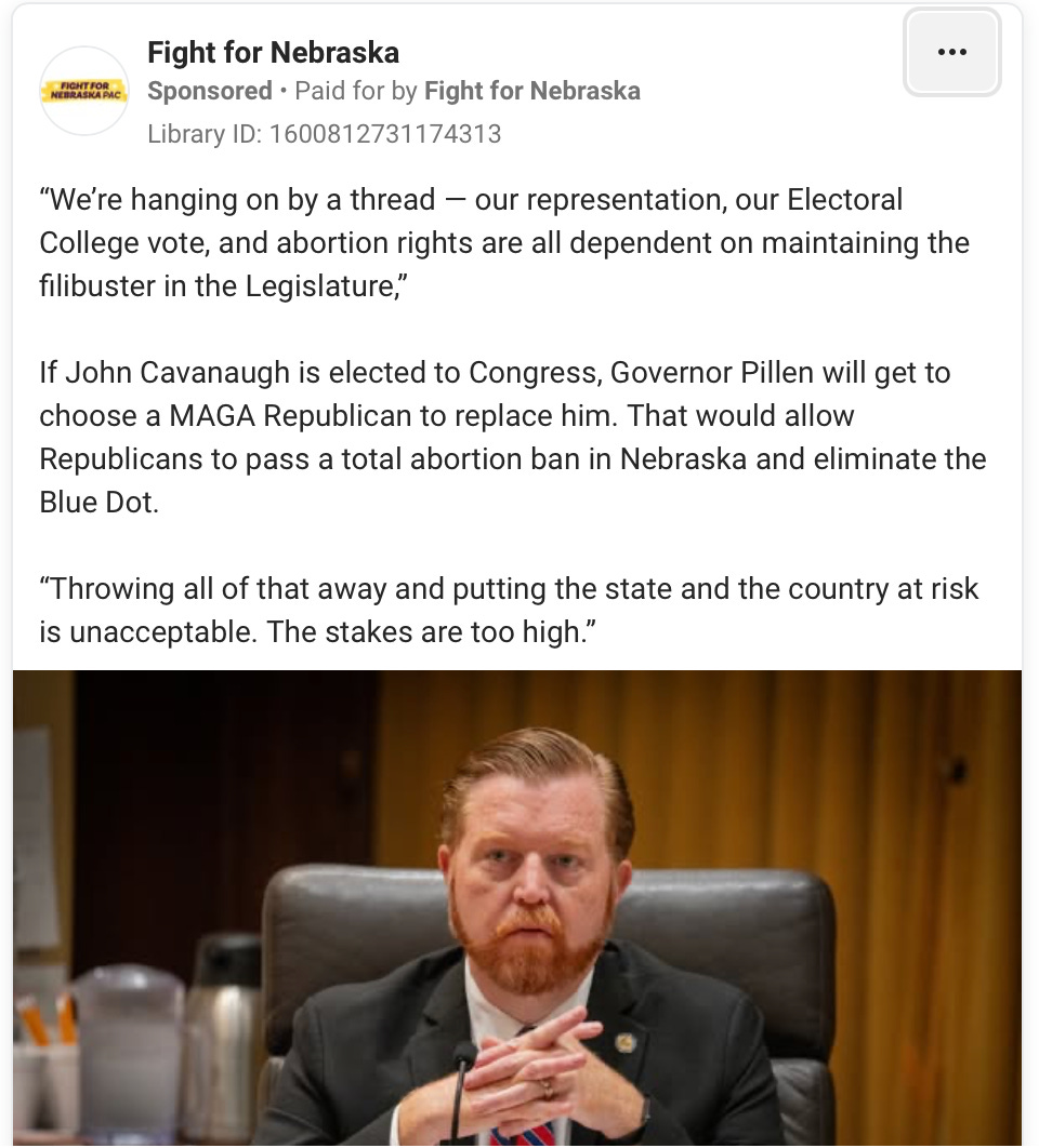 “We’re hanging on by a thread — our representation, our Electoral vote, and abortion rights are all dependent on maintaining the filibuster in the Legislature,” one Facebook ad reads. “If John Cavanaugh is elected to Congress, Governor Pillen will get to choose a MAGA Republican to replace him.”