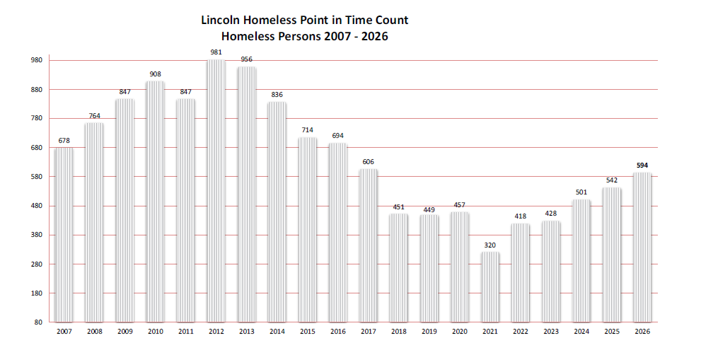 The chronic homeless count contains individuals who have been homeless for an extended period of time, usually due to issues like alcoholism, drug use, or mental health issues. The chronic homeless count for 2026 is at 594, according to the University of Nebraska’s Center on Family, Children and Law, compared to 320 in 2021.