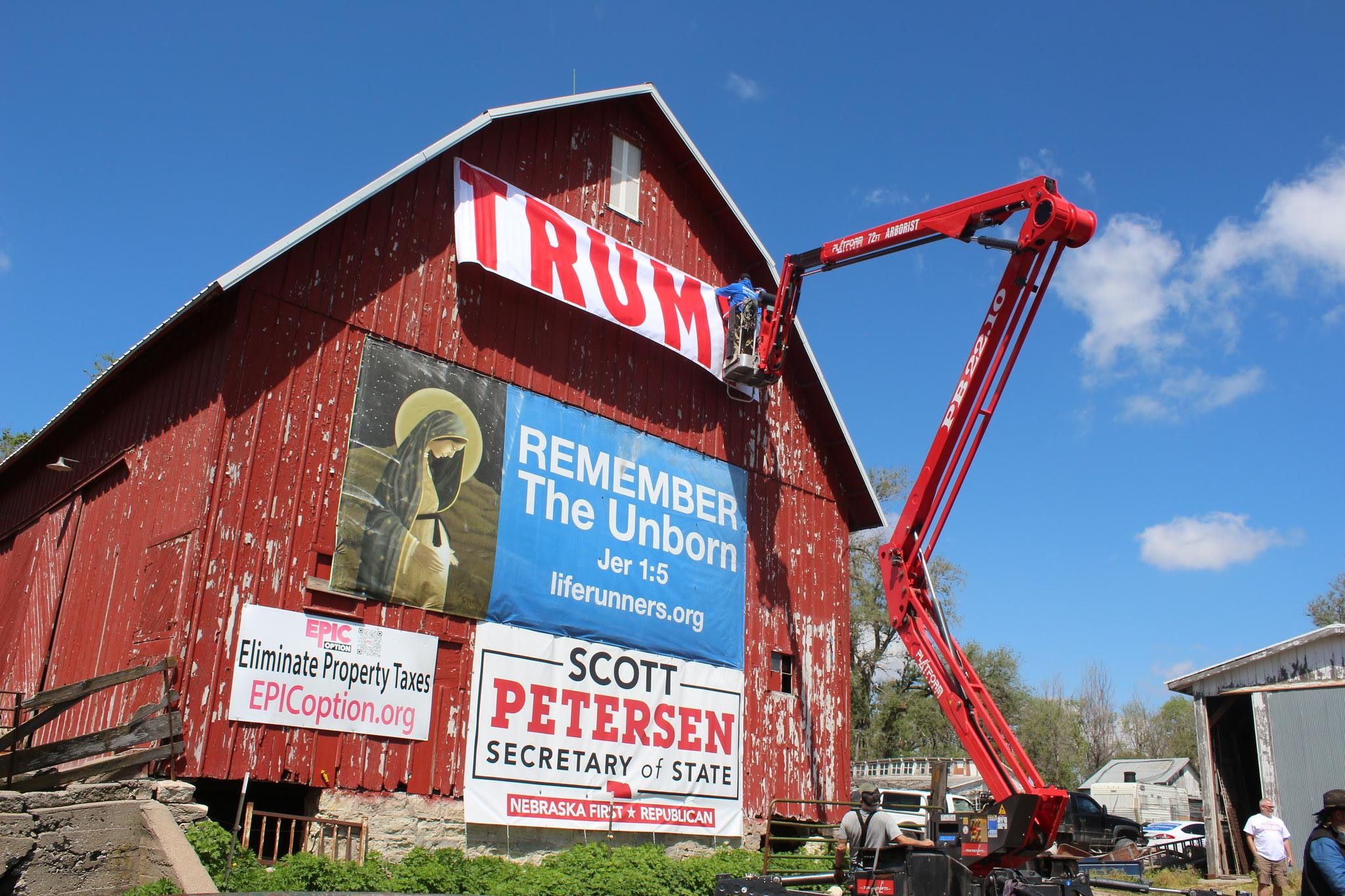 The barn shares space with banners for Scott Petersen for Secretary of State, the EPIC Option, and the pro-life organization LifeRunners.
