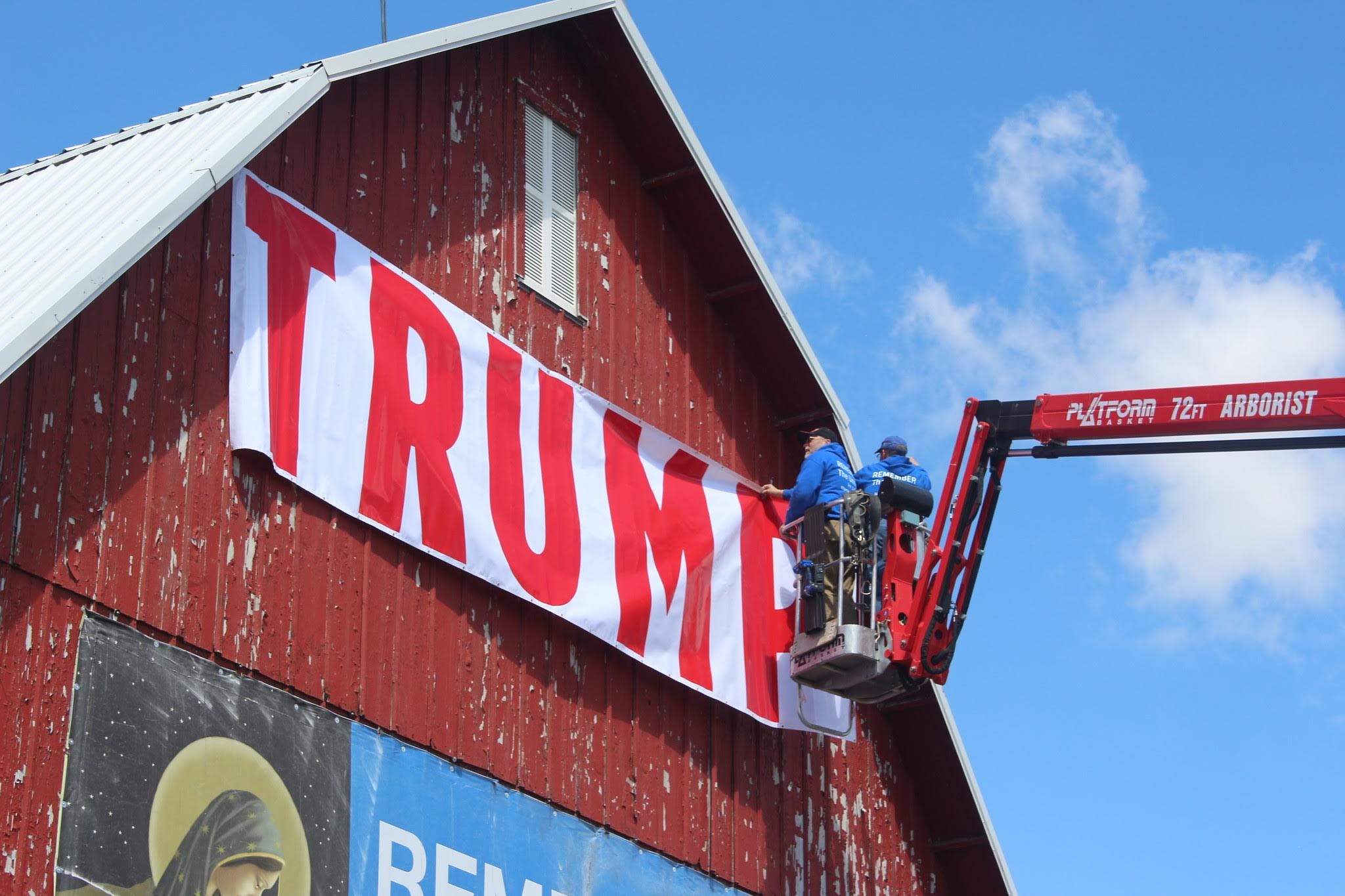Around 11:30 a.m., a handful of campaign volunteers watched as the sign was hung high atop the barn, owned by Alan Volger. Volger has had a Trump sign hanging from his barn since 2015, when Trump first ran for office.